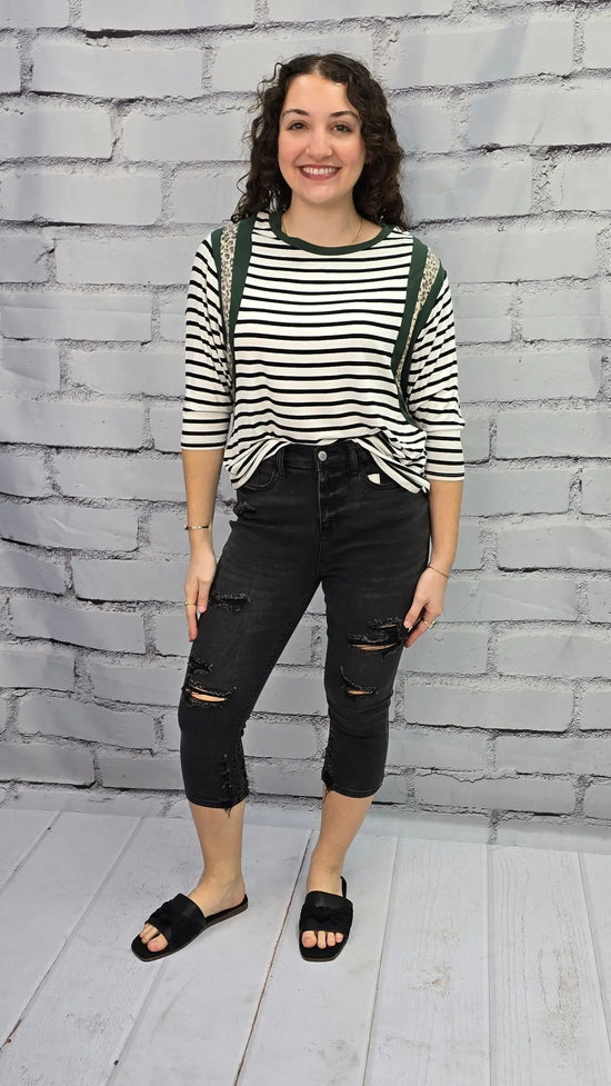 The Arden Capris bring that effortlessly bold energy with a sleek black wash, just-right distressing, and a flattering high-rise fit. The cropped length keeps things fresh and flirty, while Judy Blue’s signature stretch moves with you—so you can slay your day in total comfort.